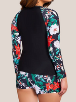 This slimming long-sleeved swimsuit perfect for sculpting your body and having a flat stomach during your outings to the pool or the beach, worn in two pieces.
